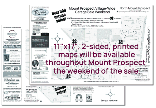 The Mount Prospect Village-Wide Garage Sale Weekend is a popular community event where hundreds of Mount Prospect (a northwest suburb of Chicago) homeowners hold their individual garage sales on the same weekend. Since 1993, this annual village-wide garage sale attracts shoppers from far and wide. As a Mount Prospect resident you will enjoy increased traffic during your sale due to the thousands of shoppers who are drawn by the endless garage sales. As a shopper, you will run out of weekend and likely cash long before you run out of garage sales to visit.